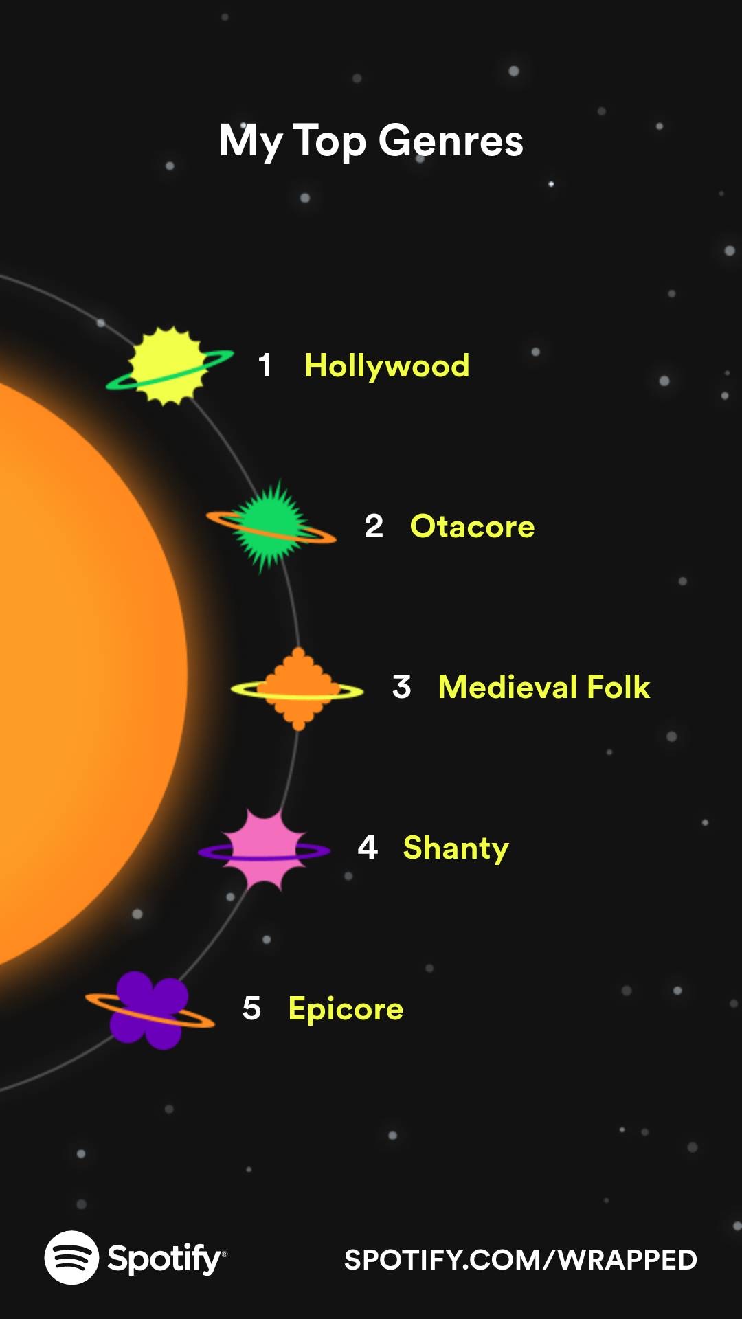 My first thoughts are on my Top Genres. I can only assume Hamilton counts as Hollywood but besides that, I have no clue how Hollywood is a genre. Also what the fuck is Otacore and Epicore?! I have never heard of those before. My next few thoughts are yup that makes sense except for Lion of Love, I know it comes up in my shuffle a lot but I could have sworn other songs played more than that.